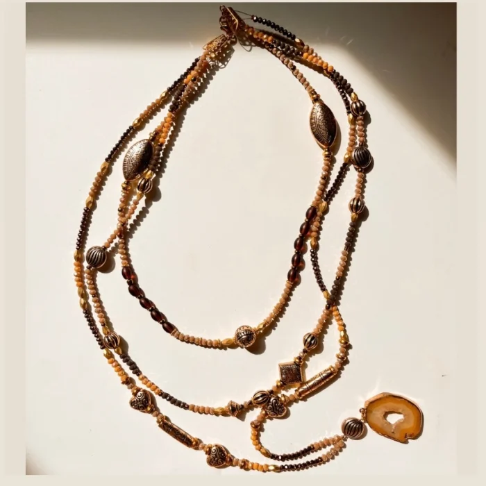 Doğal taş çeşitleri ve antik boncuklar kullanılmıştır.
