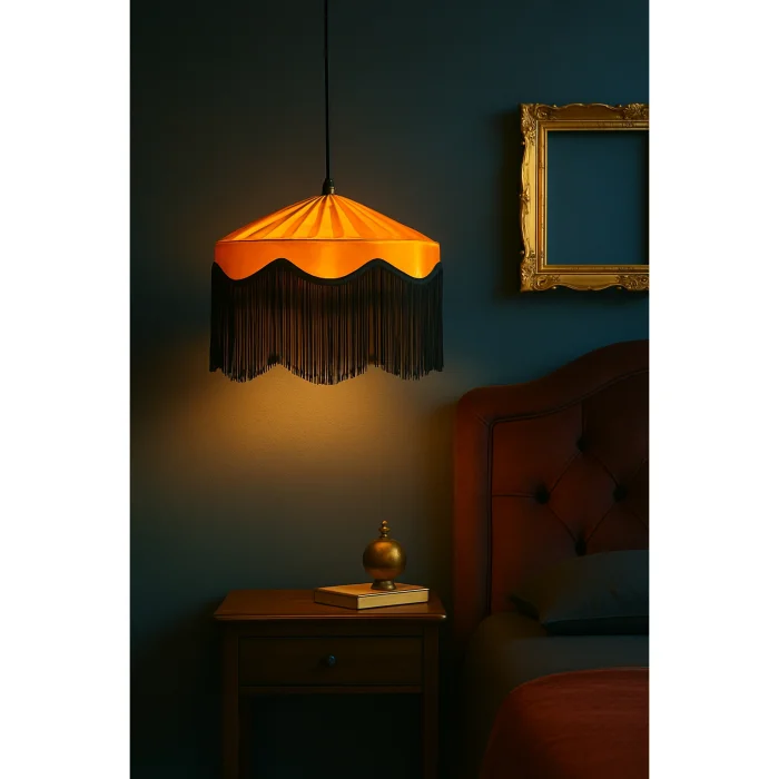 Saten Portakal & Gece Siyahı: Işığı yansıtan portakal tonundaki saten gövde, siyah püsküllerle derinlik kazanır. Loş mekânlarda parlayan bir karakter yaratır.