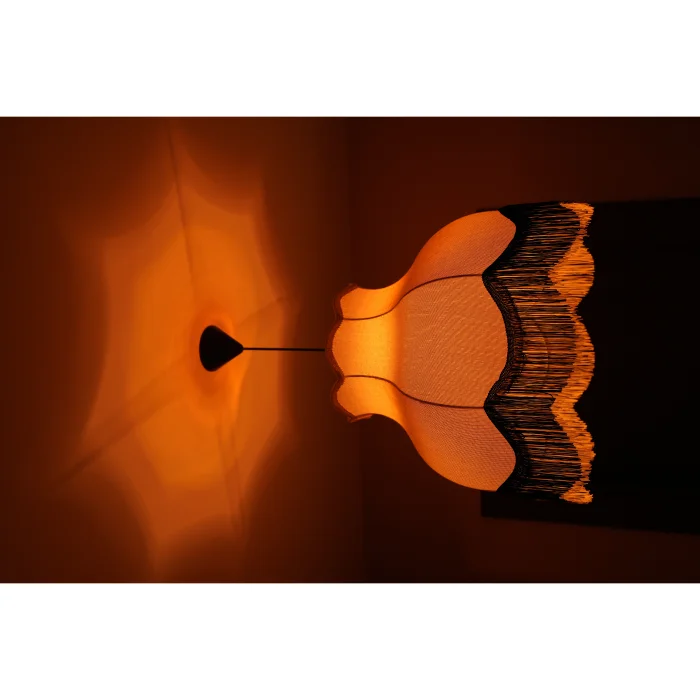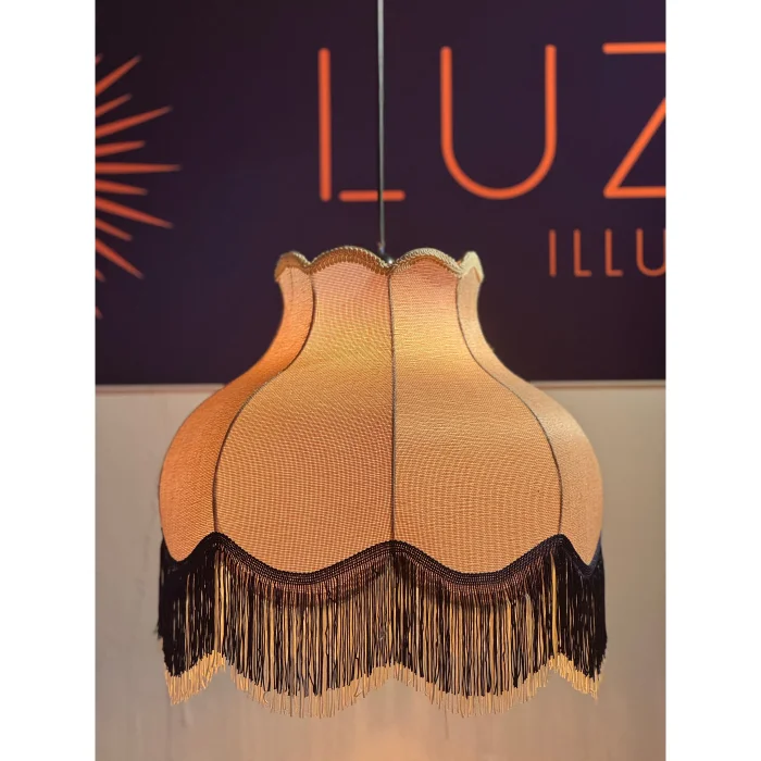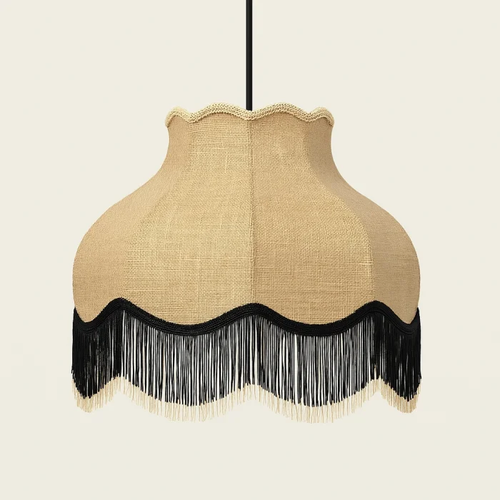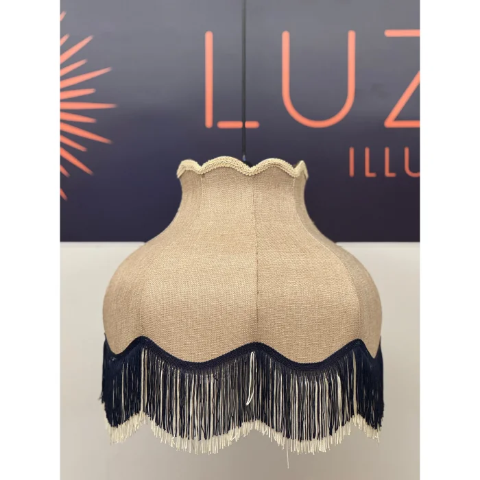 Victoria Sarkıt Avize, keten kumaşın doğal bej tonunu siyah-krem püskül detayıyla buluşturarak nostaljik ama modern bir stil sunar. Her detayında sadelikten gelen bir zarafet hissi vardır.
