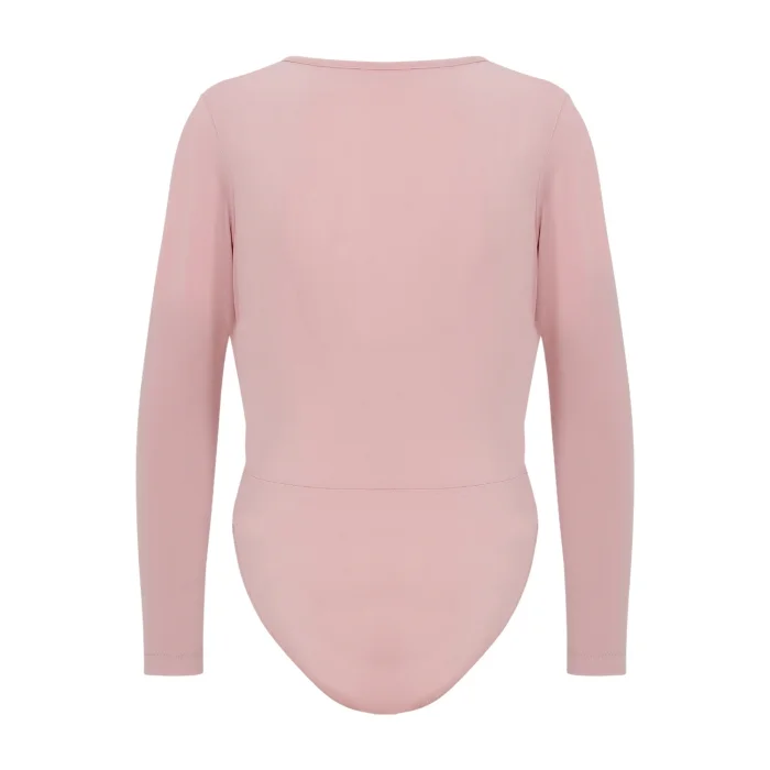 derin V yakalı, uzun kollu, alt kısım çıtçıt düğmeli bodysuit