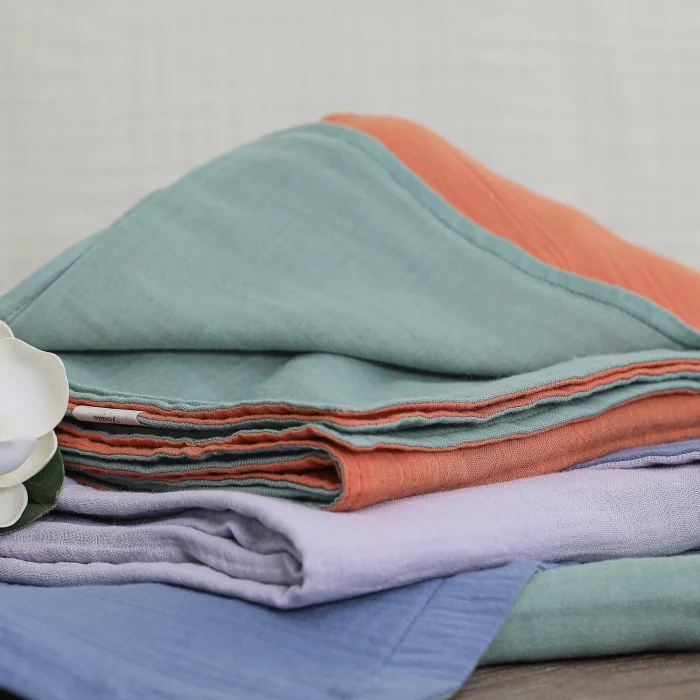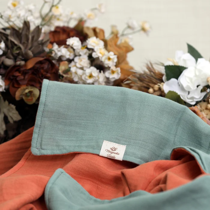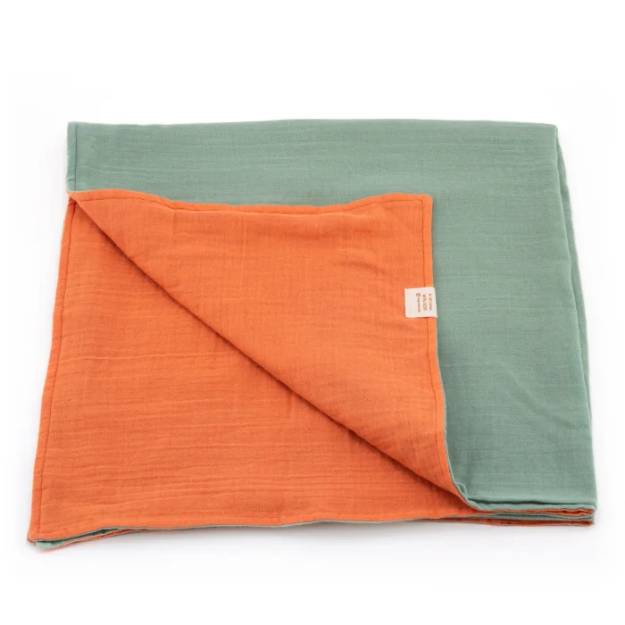 Battaniyemiz %100 pamuk muslin kumaştan üretilmiştir. Çift taraflı kullanılabilir, bir tarafı yeşil diğer tarafı ise turuncudur.