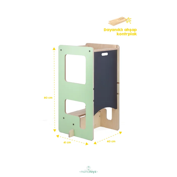 Mamatoyz’un bu yenilikçi ürünü, çocukların güvenli bir şekilde keşfetmelerine ve öğrenmelerine yardımcı olmak için tasarlanmıştır. Ürün, %100 huş kontrplaktan üretilmiş olup zararlı kimyasallar içermez; böylece çocuğunuzun sağlığına zarar vermez. Ürün Özellikleri: Çok Yönlü Kullanım: Hem dikey hem de yatay olarak kullanılabilir. Dikey pozisyonda çocuklarınız için bir öğrenme kulesi olarak işlev görürken yatay pozisyonda bir masa veya oyun platformu olarak kullanılabilir. Kara Tahta Eklenebilir: Dikey pozisyonda kullanım sırasında çocukların yaratıcı oyunlar oynayabilmesi için kara tahta eklenebilir. Dayanıklı ve Sağlam: Huş kontrplak malzeme, ürüne ekstra dayanıklılık ve uzun ömür kazandırır. Zararlı Kimyasal İçermez: Çocuğunuzun güvenliği ve sağlığı bizim için önceliklidir. Bu nedenle ürünümüzde zararlı kimyasallar kullanılmamıştır. Estetik Tasarım: Modern ve minimalist tasarımıyla her türlü ev dekorasyonuna uyum sağlar. Çocuklarınızın güvenli bir şekilde oynayıp öğrenmeleri için mükemmel bir seçim olan Mamatoyz 07 Kule Flip Oyun ve Eğitim Kulesi, ebeveynlerin de içini rahatlatacak özelliklerle donatılmıştır.