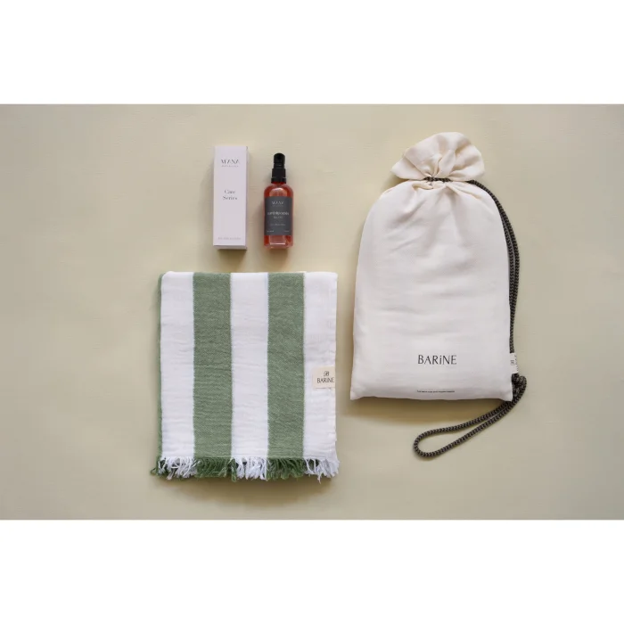 Striped Gauze Pestemal Green 90x175 cm, peştemal çantası ile birlikte.