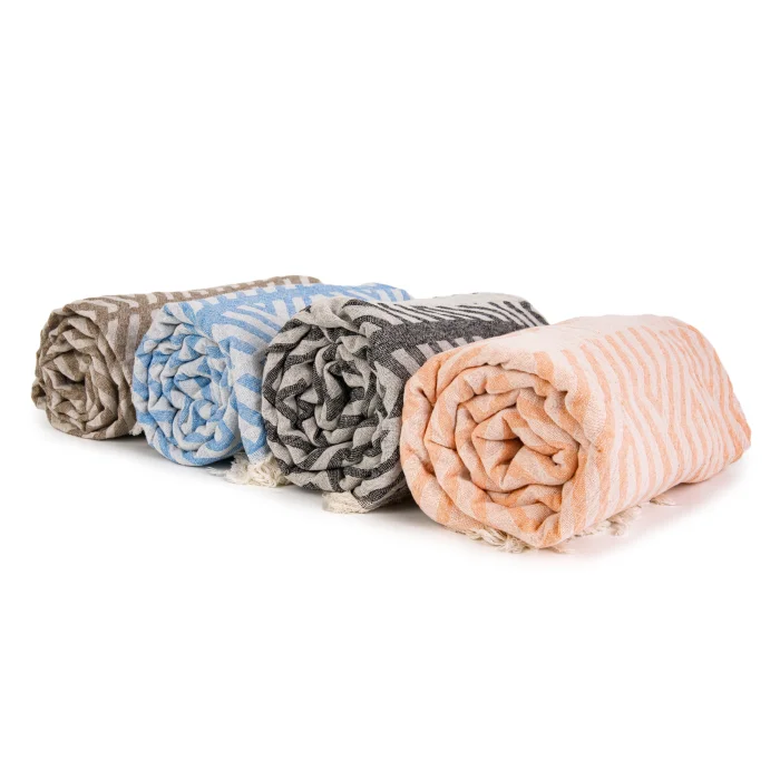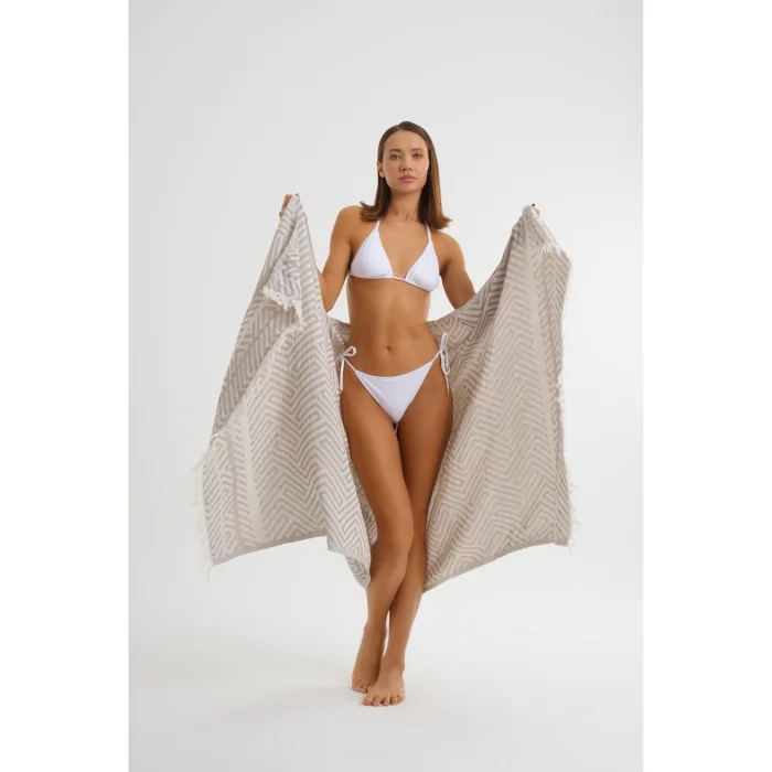 %100 pamuk, jakarlı, 325 gr.,100x180 ebatında, siyah&beyaz, çift taraflı, plaj havlusu, peştemal. Denizli'de üretilmiştir.