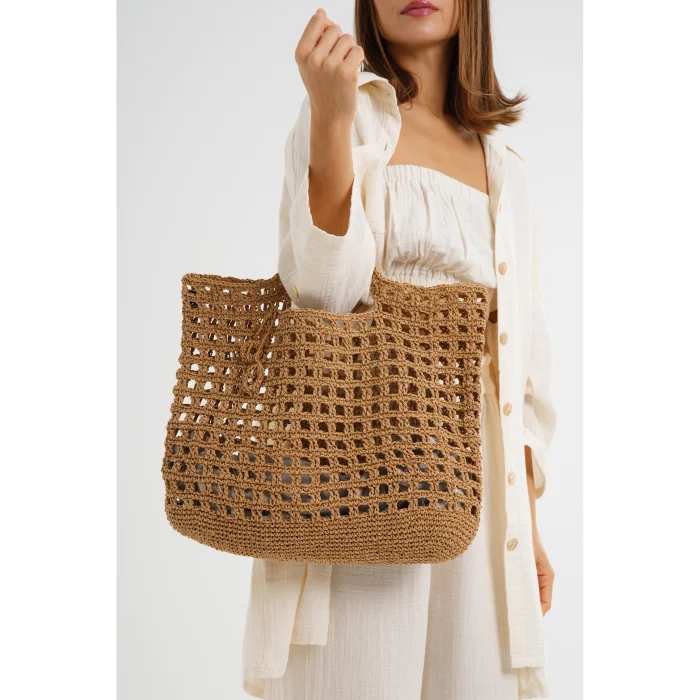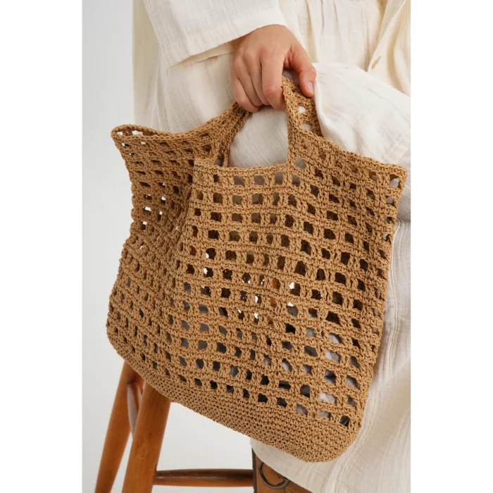 Hasır rengi kağıt ile %100 el yapımı, örme, kafesli, plaj çantası. Derinlik 40 cm, en 50 cm