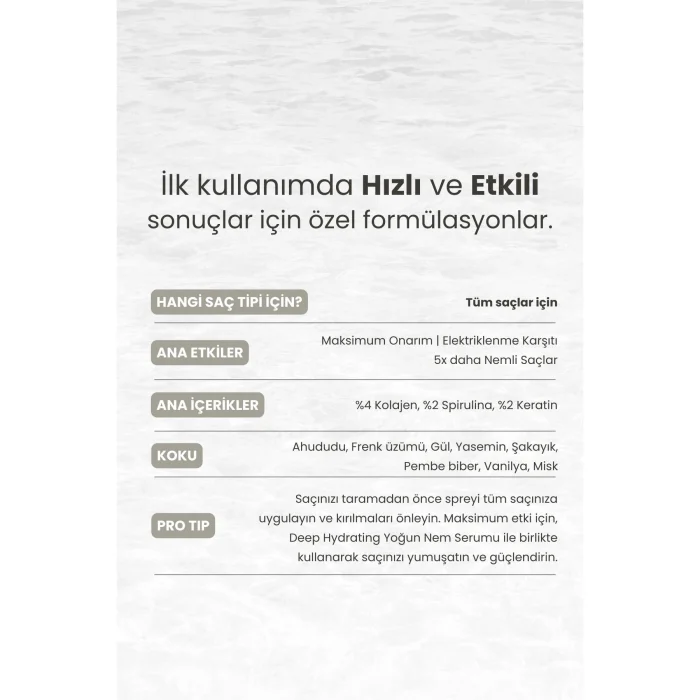 Hasar görmüş ve yıpranmış saçları canlandırmayı amaçlayan bir onarıcı bakım spreyi.