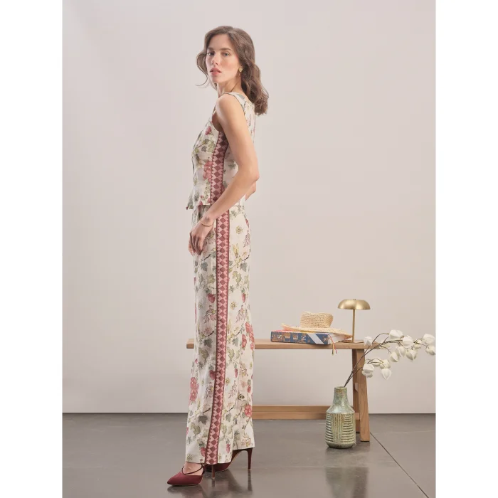 Çiçek desenli, keten, palazzo pantolon. Yüksek bel. Önden fermuarlı, yandan cepli. Yandan kontrast desenli şerit. Standart kalıp.