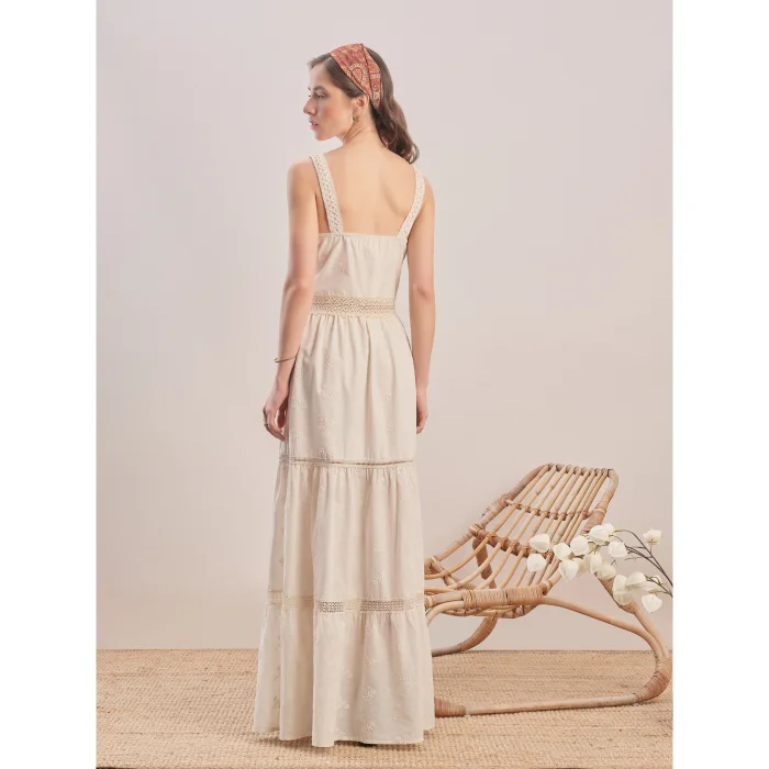 Bohem tarzda, önden düğmeli ve askılı maxi elbise. Özenle işlenmiş zarif nakış figürleri. Bel ve bacak kısımlarında nakışlı şeritler. Standart kalıp.