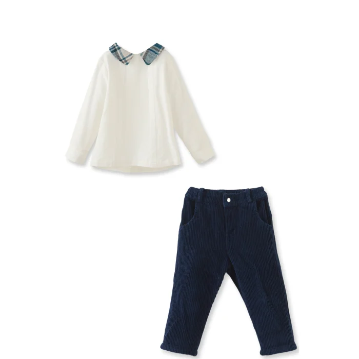 İki parçalı takım. Uzun kollu, ekose yaka detaylı. Ön kısımda iki pat detaylı, arkası boydan çıtçıtlı. Kadife pantolon beli yarım lastikli, önü düğmeli, ön cepli.