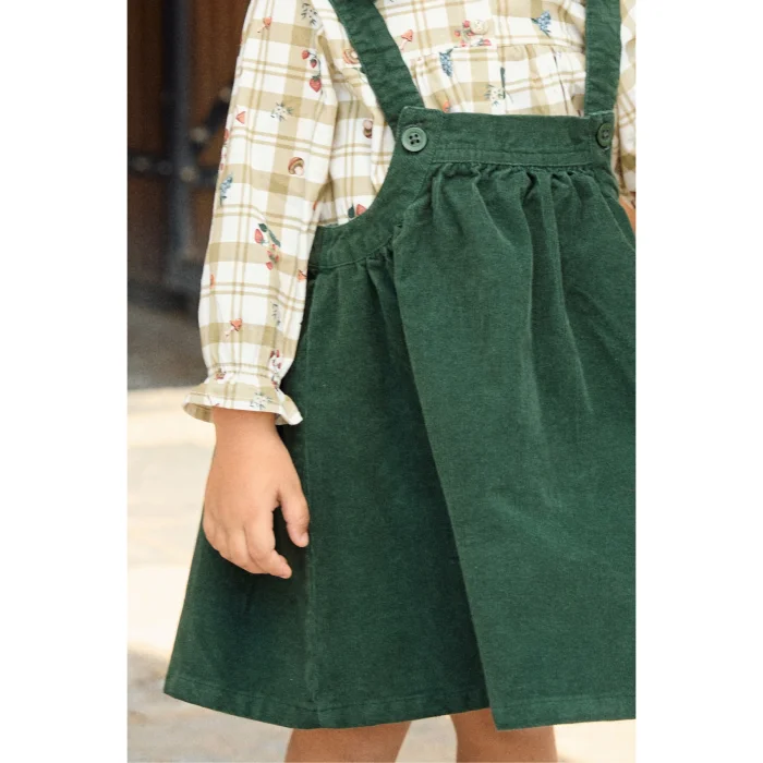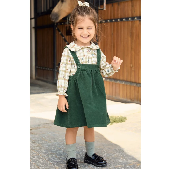 İki parçalı takım. Uzun kollu gömlek, kol ucu gipe detaylı bebe overlok. Yaka fırfır detaylı, önü düğmeli. Kadife jile, düz yaka ve ayarlanabilir düğme askılı. Önü ve arkası pile detaylı.