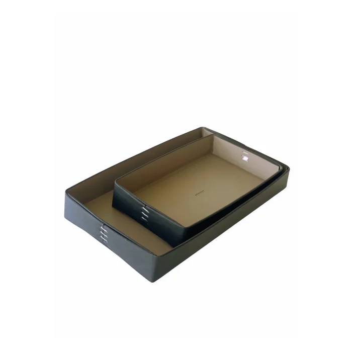 En yüksek kalitede zanaatkarlıkla üretilmiş, "elma derisi" olarak bilinen bitki bazlı bir vegan malzemeden yapılmış olup, lüks deri hissine sahiptir. Dekoratif el dikişleriyle, minimalist modern tasarımıyla her odaya zarif bir dokunuş ekler. İki boyutta sunulmaktadır: Küçük boy, 26 cm x 17 cm ölçülerinde ve Büyük boy, 35 cm x 21 cm ölçülerindedir.
