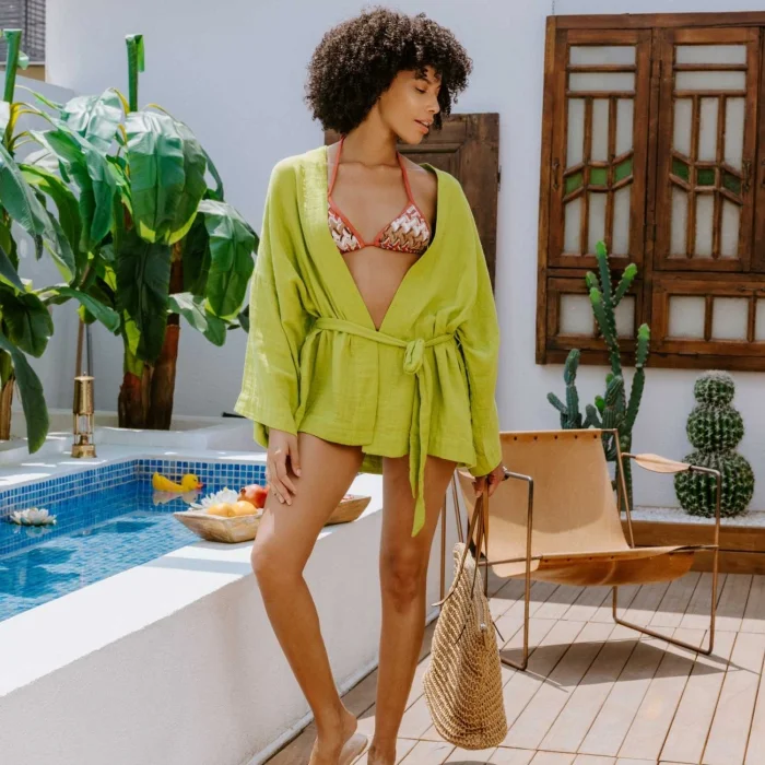 Bu muhteşem parça, özgün tasarımı ve konforlu dokumasıyla öne çıkıyor. Mini kadın kimono kaftan, beli kuşak detayıyla vücuda hoş bir şekilde otururken, müslin dokuma kumaşı sayesinde gün boyu rahatlık sağlıyor. Kısa kesimiyle hareket özgürlüğü sunarken, beli kuşakla vurgulanan bel kısmı da feminen bir siluet oluşturuyor.