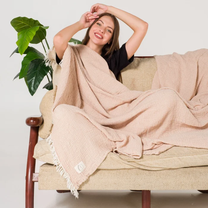 Organik %100 Türk pamuğundan üretilen 3 katlı çift taraflı nefes alan bürümcük müslinimiz , çok özel dokuma tekniğiyle üretilmiş yumuşacık dokusuyla yatak şalı, koltuk şalı, TV Battaniyesi, pike olarak 4 mevsim çok amaçlı kullanılır.
