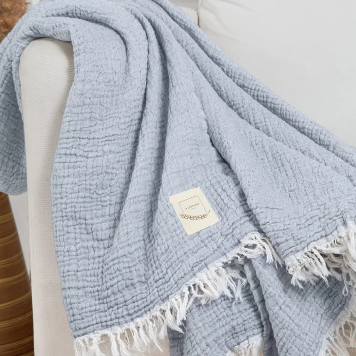 Organik %100 Türk pamuğundan üretilen 3 katlı çift taraflı nefes alan bürümcük müslinimiz , çok özel dokuma tekniğiyle üretilmiş yumuşacık dokusuyla yatak şalı, koltuk şalı, TV Battaniyesi, pike, atkı, şal, bebek oyun matı, çocuk battaniyesi ve su emici özelliğiyle havlu, peştamal olarak 4 mevsim çok amaçlı kullanılır . Müslin grubumuzun en özeli olan Gold serimizin huzur veren dokusuyla mutlu olmamanız imkansız. Çift katmanlı dokuması ve kilitleme tekniğiyle birleştirilen katmanları, Gold örtümüzü hem yumuşak, hem esnek hem de göründüğünden hafif kılıyor. Bürümcüklü dokusu, doğal ve rahat hali yıkanmadan sonra da aynı özelliğini devam ettirir. Türkiye’de üretilmiştir.
