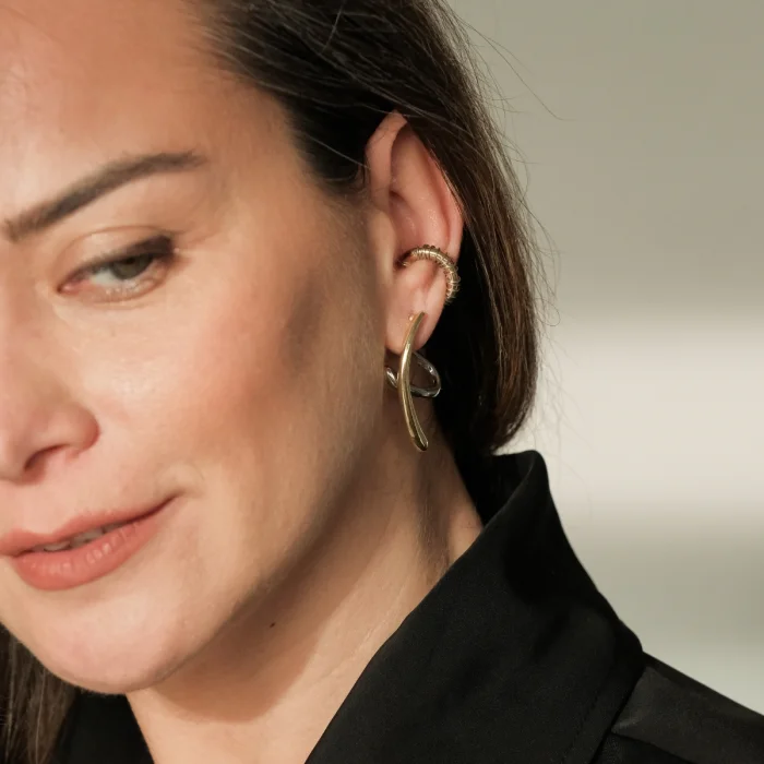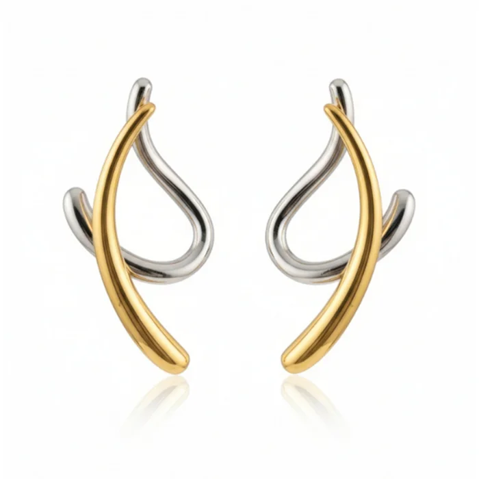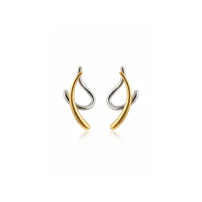 Calvi Two Tone Küpe, altın ve gümüş kaplamanın yumuşak, akışkan formlarla buluştuğu modern bir tasarımdır. Kulak hattını takip eden heykelsi yapısı sayesinde sade ama iddialı bir duruş sunar. İki tonlu formu, farklı takılarla kolayca kombinlenmesini sağlar ve stile güçlü bir denge katar.