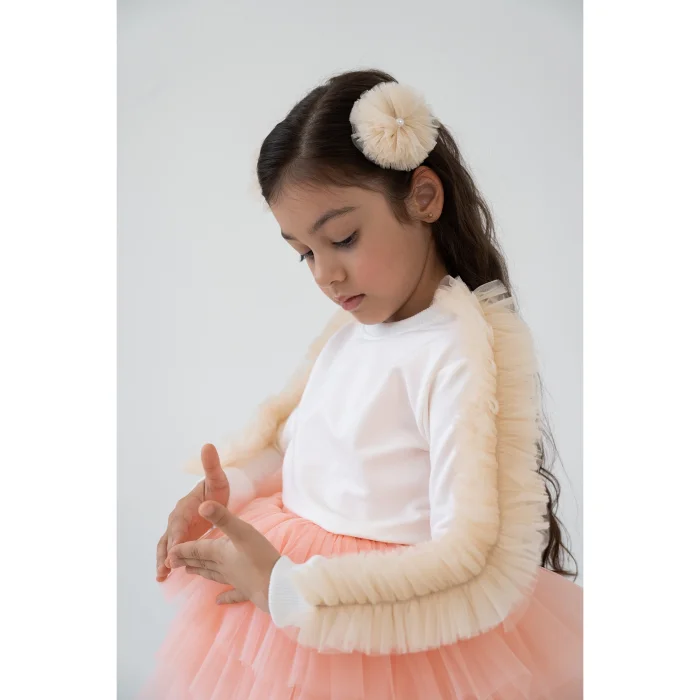 Kırık Beyaz 2iplik kumaştan üretilmiştir.Bel hizasında kısa crop sweat. Omuz ve kolları tül fırfır detaylı.