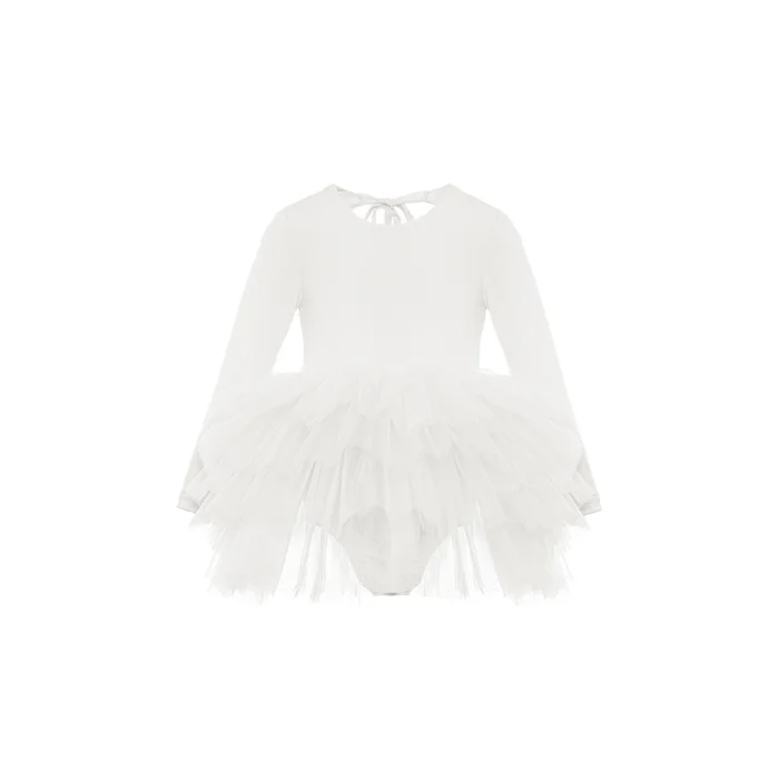 Bisiklet yaka, sırtı açık ve boyundan bağlama detaylı kırık beyaz tütü elbise. Tütü etek altında çıtçıtlı mayo astarı mevcuttur.