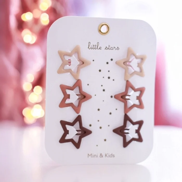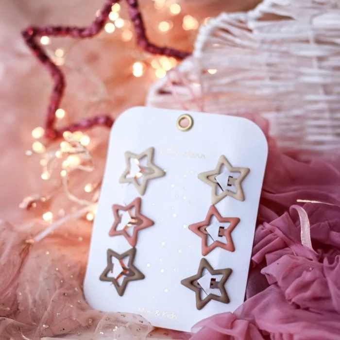 Mini Yıldız Tokalar Ürün Açıklaması: Parlak simlerle kaplanmış yıldız şekli minik kızlar için göz alıcı bir şıklık sunar. Materyal: Glitter, Metal Boyut: 3x3 cm Renkler: Lila, Pembe, Mavi,Nude
