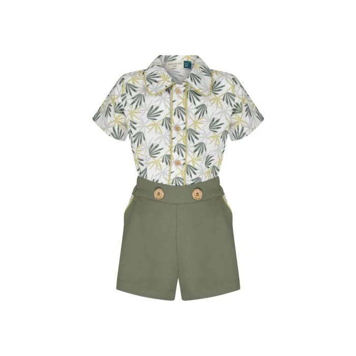 Hem şık hem de rahat olmak isteyen küçük beyler için özgün bir tasarımdır. Takıma ait şortun kumaşı Lyocell; huş ağacı, meşe veya okaliptus gibi bitkilerin odun hamuru selülozundan elde edilen sürdürülebilir / ekolojik bir türdür. Antibakteriyel bu kumaş, dökümlü yapısıyla yumuşacık ve iyi hissettiren bir dokudadır. Hem çevre hem de cilt dostu olmasıyla devrimsel etki yaratmıştır. Malzeme: Gömlek: %100 Pamuk. Şort: %100 Lyocell (Tencel) Bakım: Metal aksesuarlara doğrudan ütü kullanmayın.