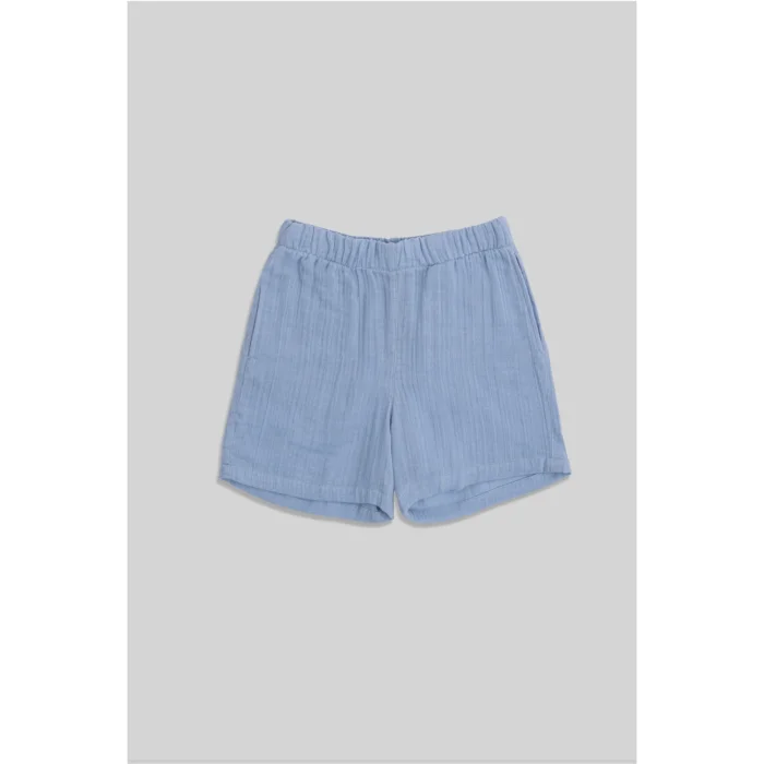 Nate Açık Mavi Erkek Çocuk Muslin Şort, hafif ve nefes alabilir yapıdaki açık mavi çocuk şortu, yüksek kaliteli %100 pamuk müslin kumaştan üretilmiştir.