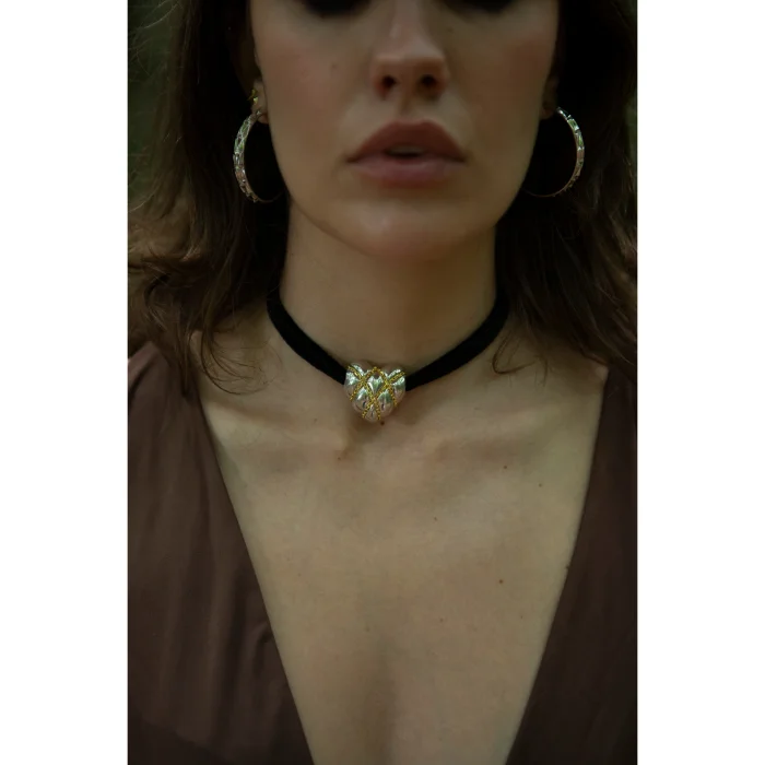 Altın kaplamalı zincirlerle sarılmış heykelsi gümüş kalp, tutkuyu, bağı ve gücü simgeliyor