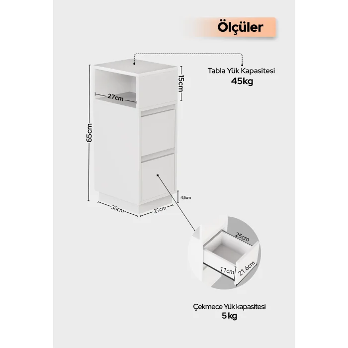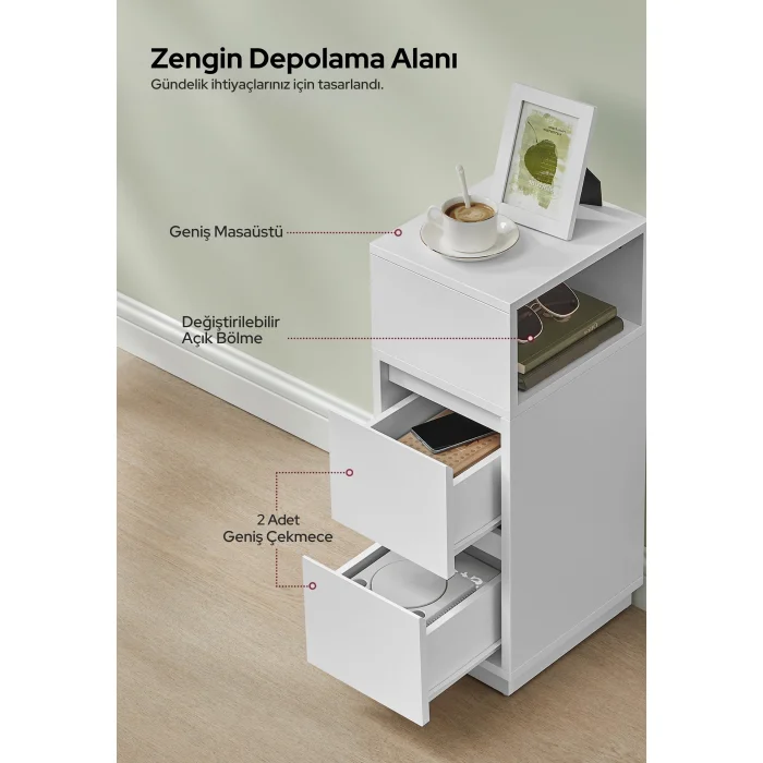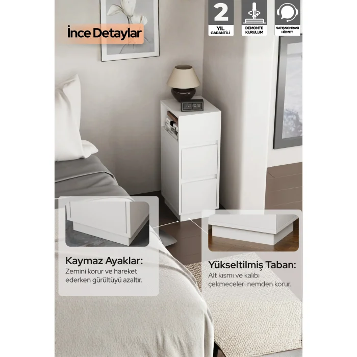Alve Dar Komodin – 2 Çekmeceli, Değiştirilebilir Açık Bölmeli Yan Sehpa Yatak Odası & Oturma Odası Minimal Tasarım