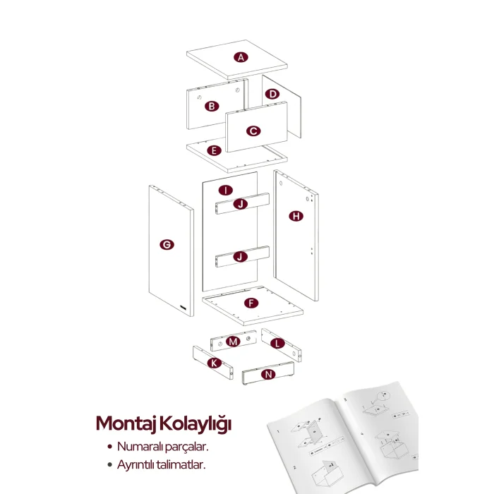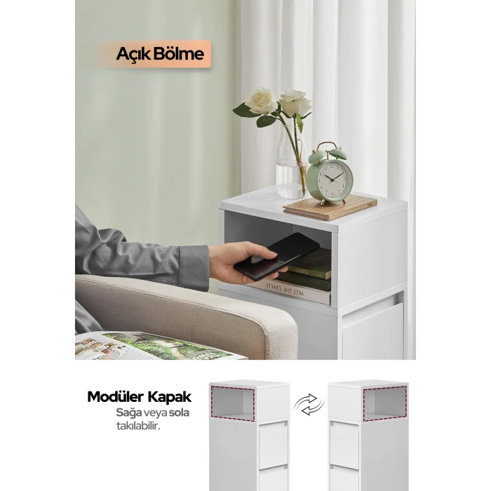 Kompakt yapısı sayesinde küçük alanlarda dahi geniş depolama hissi oluşturur. Açık raf bölümünün sol veya sağ yönlü monte edilebilmesi, ürünü yaşam alanınıza özel şekilde uyarlama imkânı sunar. Üst yüzey ise gece lambası, kitap, gözlük veya telefon gibi günlük eşyalar için ideal bir düzenleyici alan sağlar.