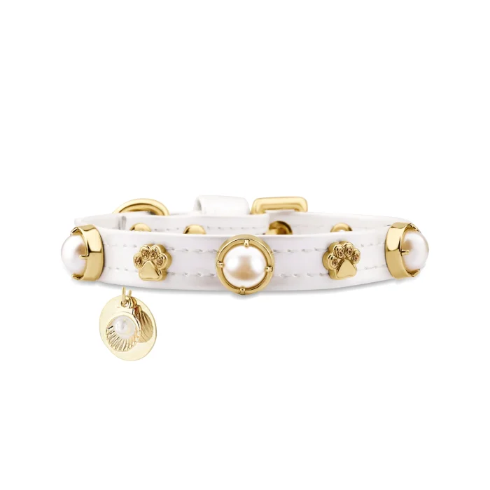 Parlak sedefli krem vegan dostu deri üzerine beyaz sofistike inciler, altın kaplama özel yuvalar ve pati figürleri ile zarif bir şekilde süslenmiştir.