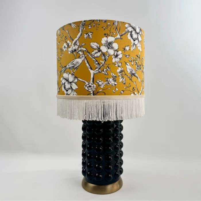 Buble siyah cam gövde, prinç parçalar ve desenli püsküllü başlığıyla el yapımı abajur. Ürün Ölçüleri : Genişlik : 35 cm Yükseklik : 64 cm Materyaller : Gövde: Cam - Prinç Başlık: Desenli Pamuk kumaş başlık E-27 Duy Ürün üzerinde 2 metre aç/ kapa anahtarlı fişli kablo vardır.