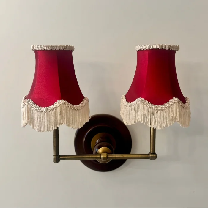 Vivaldi Twin aplik, pirinç parçalar, saten kumaş, pamuk püskül ve doğal ahşap detaylarıyla benzersiz bir aydınlatma ve duvar dekorudur.