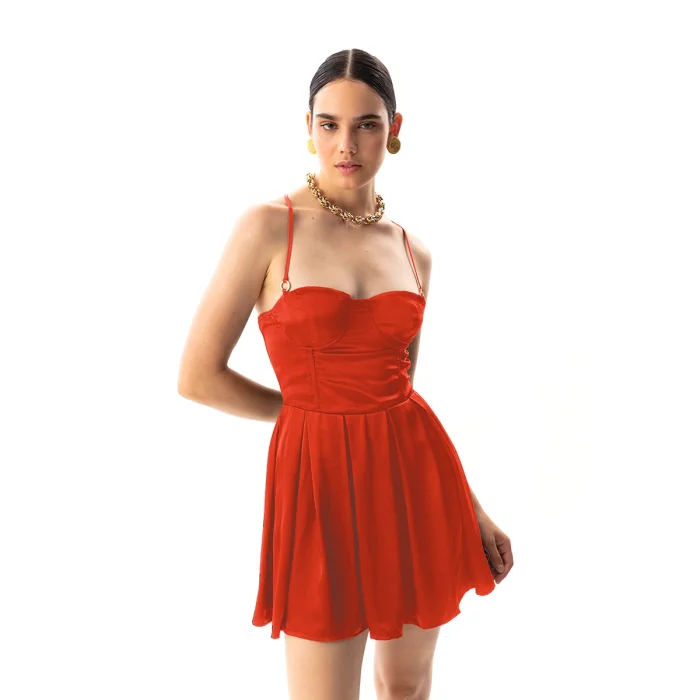 •Göğüs ve korse balenli büstiyer elbise •Askılar, omuzlardan geçip sırtta bedene göre sıkılarak bağlanır •Arkası fermuarlı •Karbon ayak izi bırakmayan bu malzeme, başından sonuna kadar hayvansal malzeme olmamasını sağlayan yenilikçi bir vegan tekstil işlemiyle üretildi. •Yumuşacık ipeksi kumaş size nazik olduğu kadar dünyaya da nazik. • Resimdeki mankenin giydiği ürün bedeni S bedendir • Manken ölçüleri:83/58/90