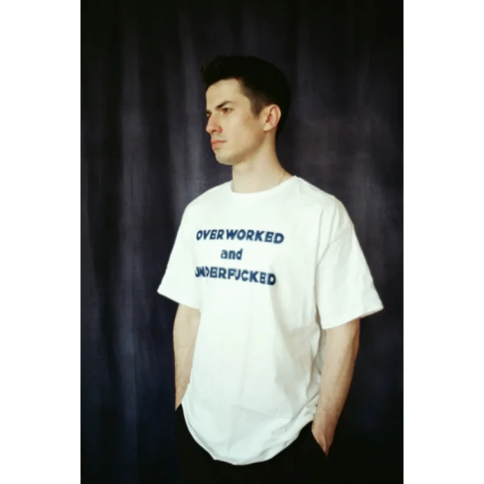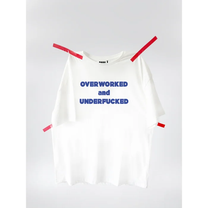 "OVERWORKED AND UNDERFUCKED" baskılı t-shirt.yuvarlak yakalı. %100 pamuklu kumaştan üretilmiştir.oversize.