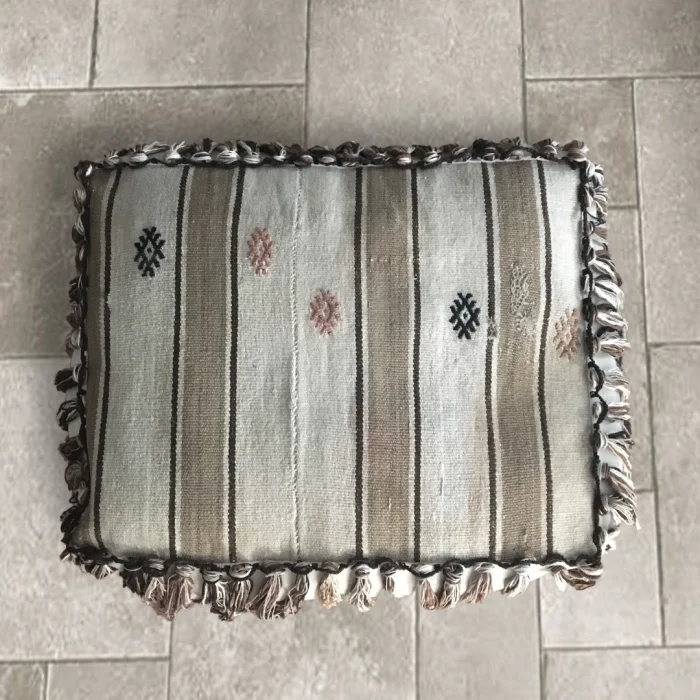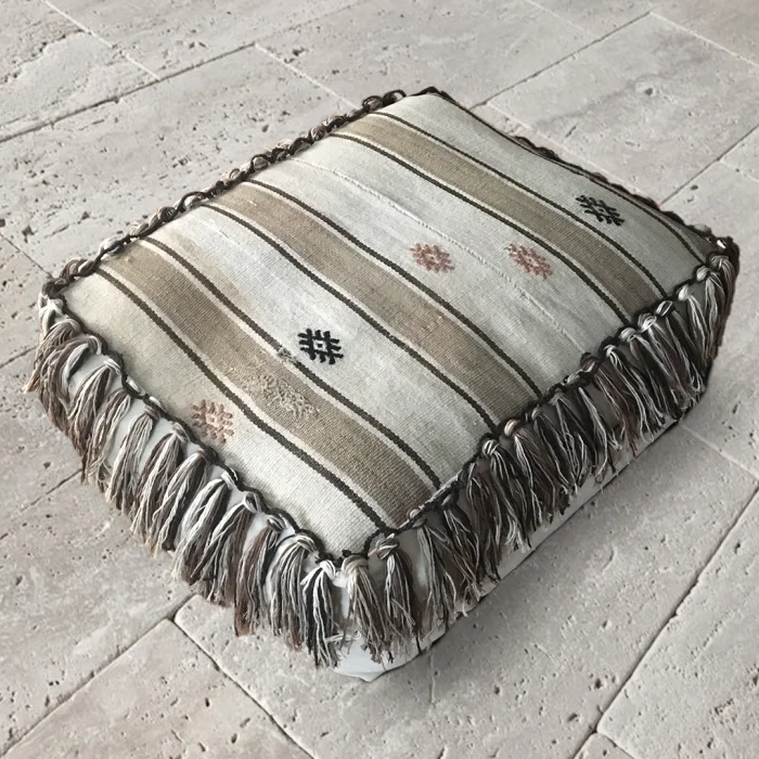 Vintage el dokuması Yörük çuvalından dikildi. Yan yüzeyleri ve altı ham pamuklu gabardin kumaştır. Kenarları el dikişli ve uygun renkte iplerden püsküllüdür. Ölçüleri 50x65x26 cm. El dokuması olduğu için ölçülerde ufak farklılıklar olabilir. Sadece kılıftır.