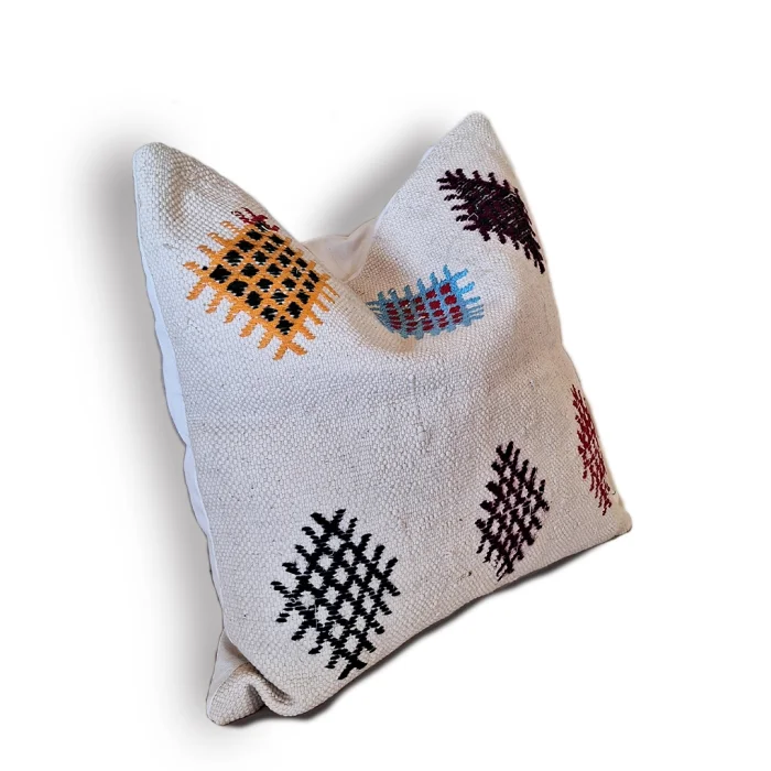Vintage Yörük çuvalından dikildi. El tezgahında çeyiz olarak yapılmış bu çuvalların dokuması Kenevir ve pamuk karışıktır. Ölçü: 53x53 cm. Arka yüzü pamuklu kumaştan fermuarlıdır. Sadece kılıftır.