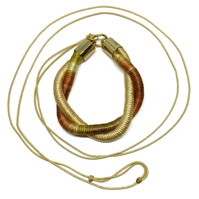 Doğal boyalar ile boyanmış ipek iplikler, pamuk halatlar, paraşüt ipi ve altın kaplama pirinç aksesuarlar kullanılmıştır.