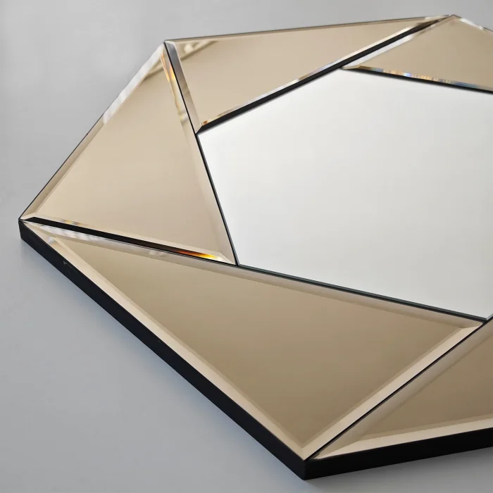 • Aynanın kenarlarındaki kısımlarda 2 sıra bizote işlemi yapılmıştır. Bizote aynanın kenarlarının açılı şekilde pahlanması işlemidir.Bu işlem aynaya, farklı ışık kırılmaları ve yansıtmaları ile ışıltılı, kristal ve estetik bir görsellik katar.