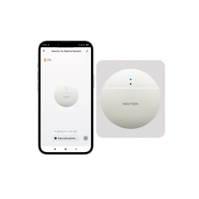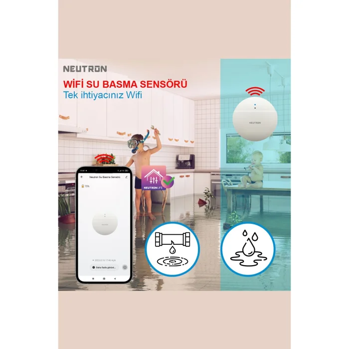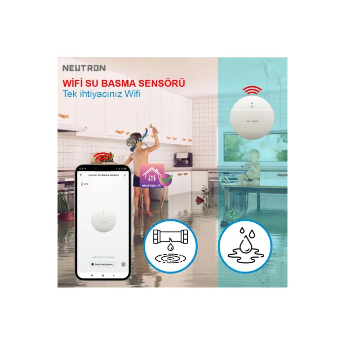 Neutron Wifi Su Basma Sensörü -Ürün Tipi: Wifi su basma sensörü -Çalışma şekli: Ortam zemininde sıvı algılandığında ikaz ve mobil uygulamaya bildirim göndererek alam verir -Kullanım alanı: Ev, işyeri, rezidans, depo vb. -Batarya süresi: Yaklaşık 1 yıl (kullanıma göre değişebilir) -Mobil uygulama: Neutronlife mobil uygulama uyumlu -Uyumluluk: Bir alarm panelinden bağımsız tek başına kullanılır