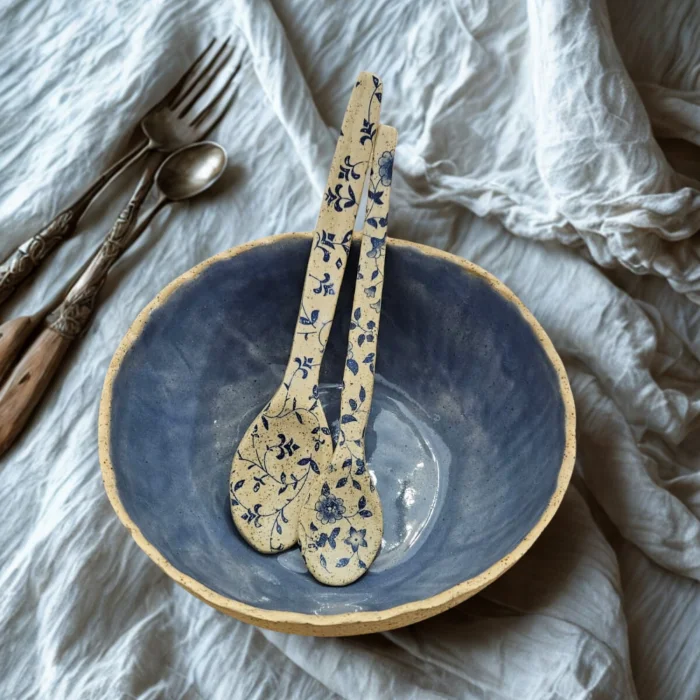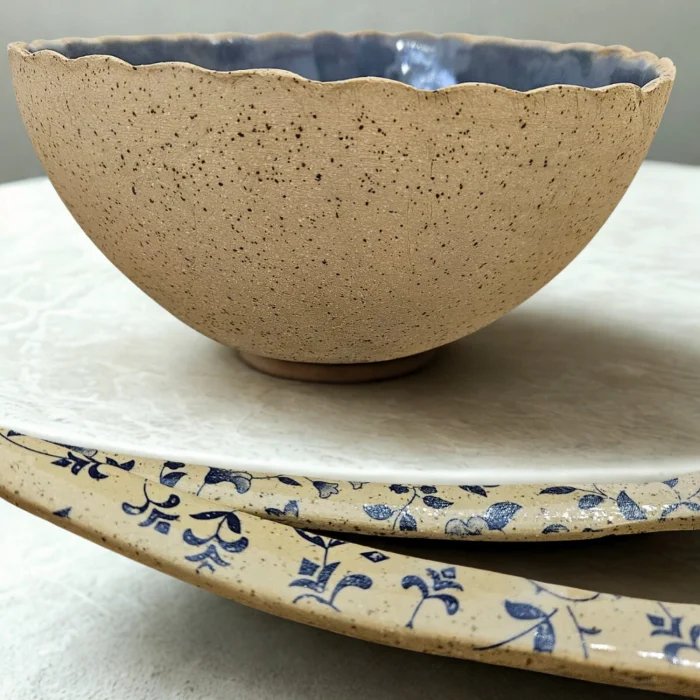 Kasenin içi artistik mavi parlak bir sır, dış kısmı çamurun kendi özelliği olan benekli yapıdadır.