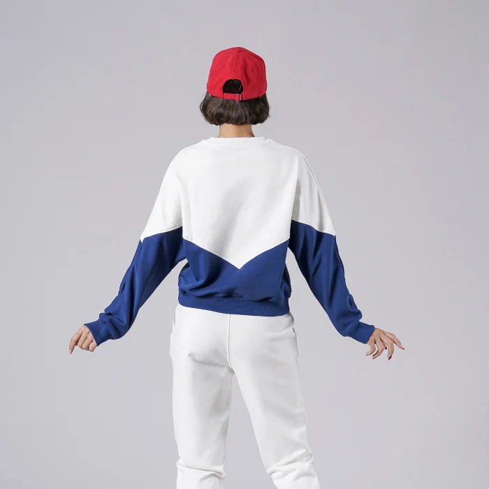 Önünde kırmızı nakış detaylı iki renk sweatshirt. Manken S beden giyiyor.