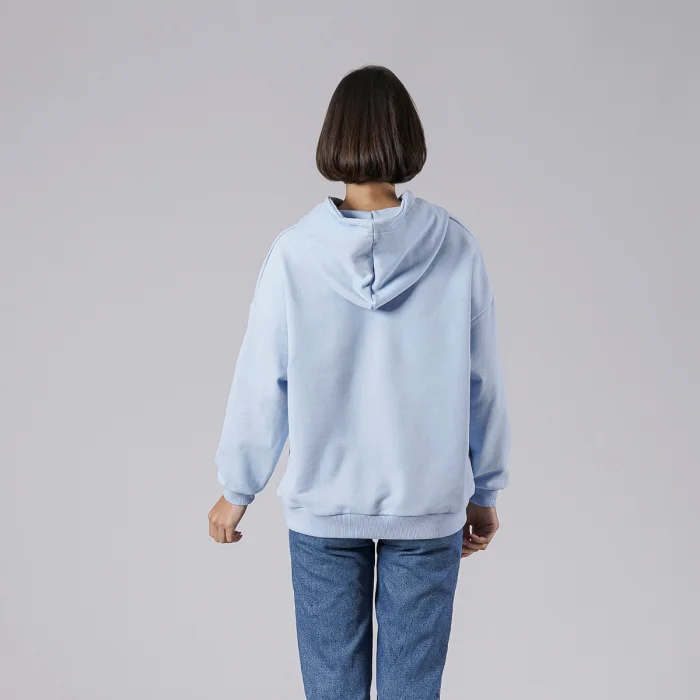 Omuzda “Fast Fashion is Nonsénse" baskılı kapüşonlu sweatshirt. Model S beden giyiyor.