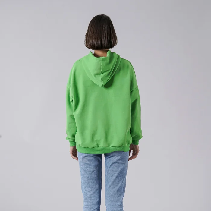 Omuzda “Fast Fashion is Nonsénse" baskılı kapüşonlu sweatshirt. Model S beden giyiyor.
