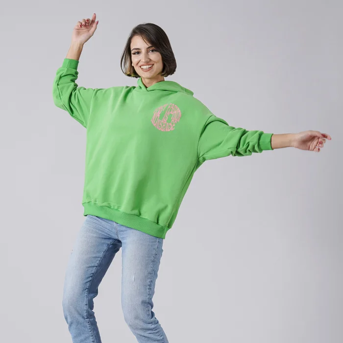 Omuzda “Fast Fashion is Nonsénse" baskılı kapüşonlu sweatshirt. Model S beden giyiyor.