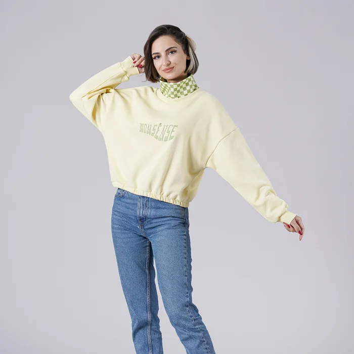 Yakasında ekose desen detaylı önünde “Nonsénse” nakışlı beli lastikli sweatshirt. Model S beden giyiyor.