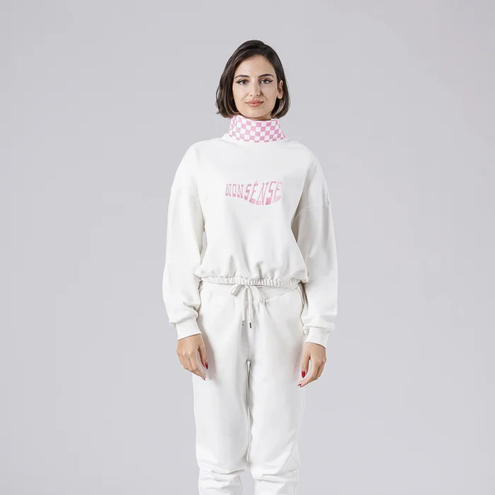 Yakasında ekose desen detaylı önünde “Nonsénse” nakışlı beli lastikli sweatshirt. Model S beden giyiyor.