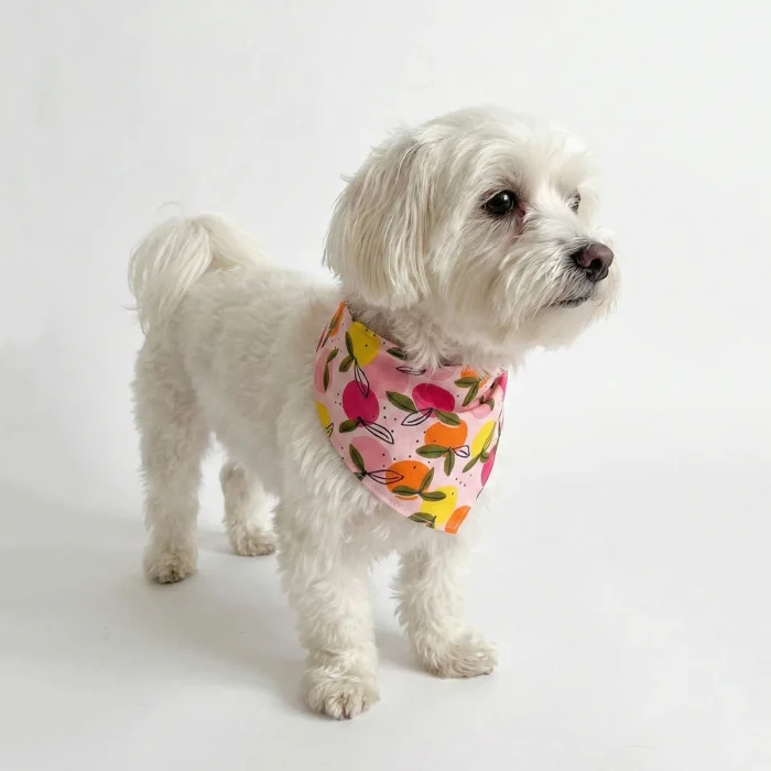 Turunçgil Desenli Pembe Köpek Fuları %100 pamuklu kumaştır.