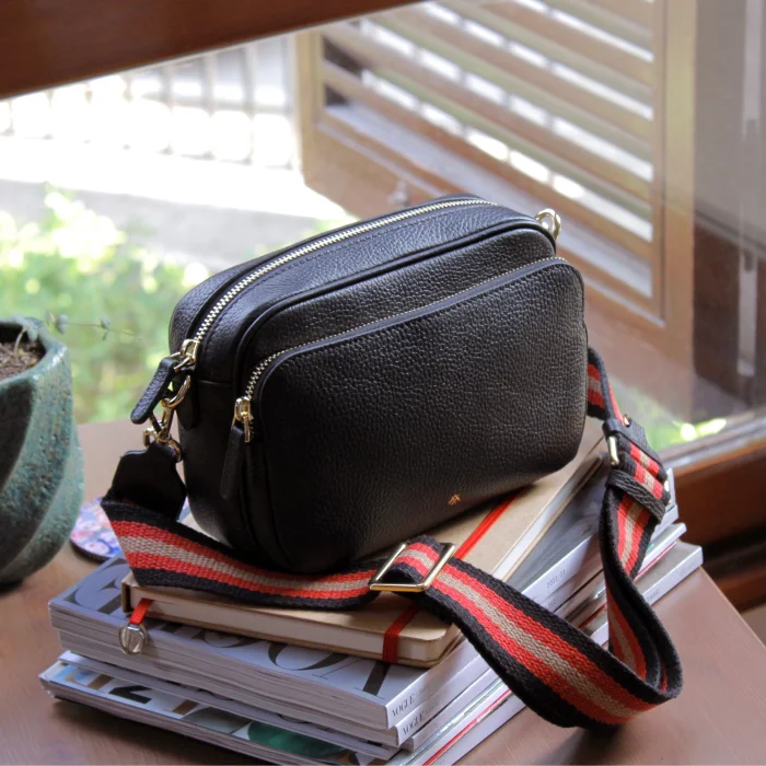 100% dana derisidir, el işçiliği ile üretilmiştir. Pamuklu kumaş astar Pamuklu dokuma askı Ön kısımda fermuarlı geniş cep yer alır. İç bölümde 1 adet açık cep yer alır. Omuzda ve çapraz çanta kullanımına uygun ayarlanabilir ve takıp çıkarılabilir askı. Askı boyu; 130 cm ve 90 cm aralığında ayarlanabilir. Altın rengi metal aksesuar kullanılmıştır.