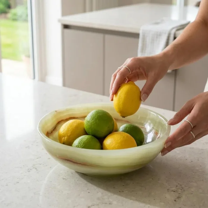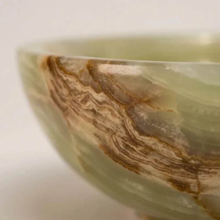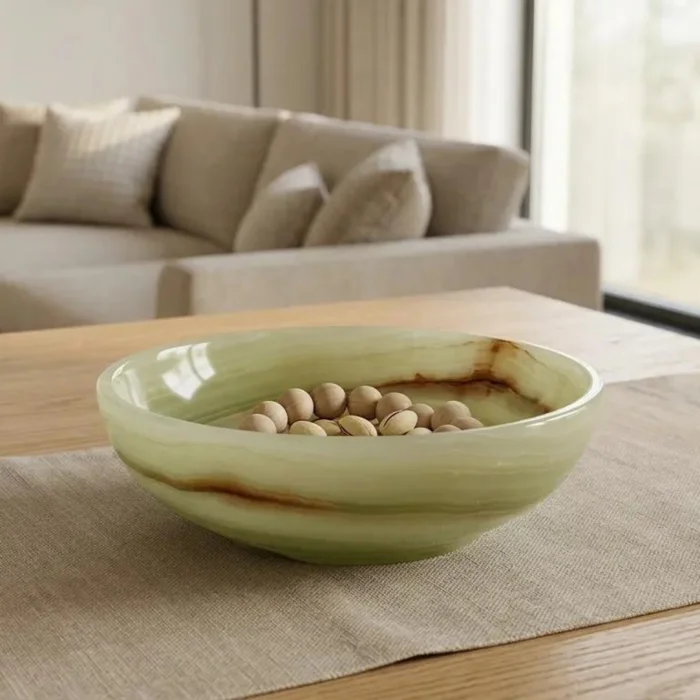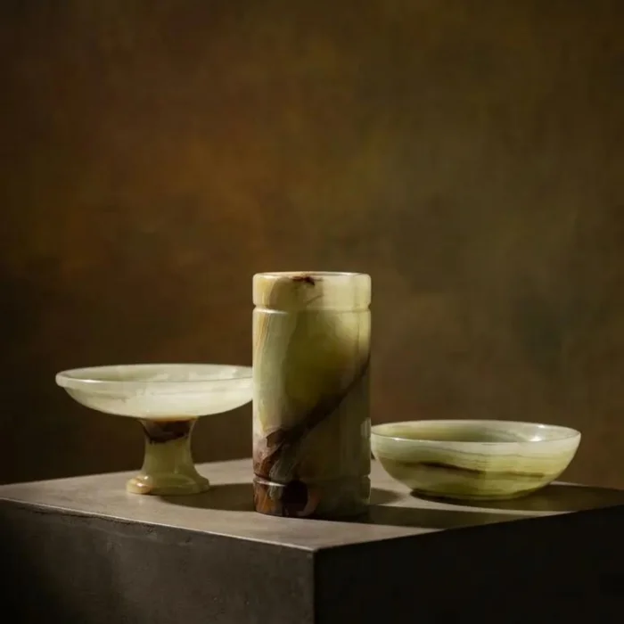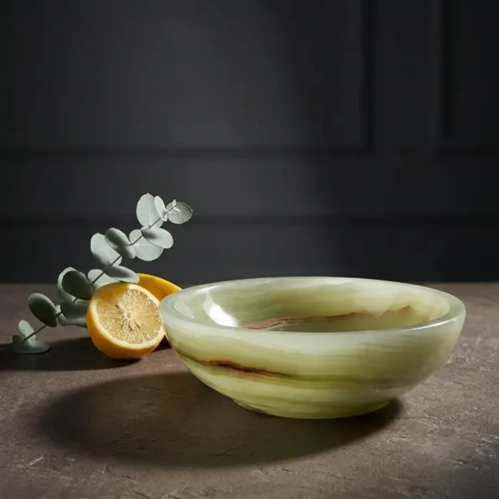 Doğal oniks taşından üretilen bu kase, yumuşak formu ve akışkan damarlarıyla mekâna dingin bir zarafet katar.