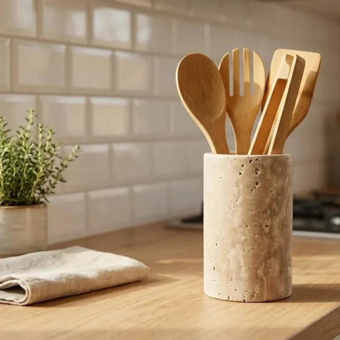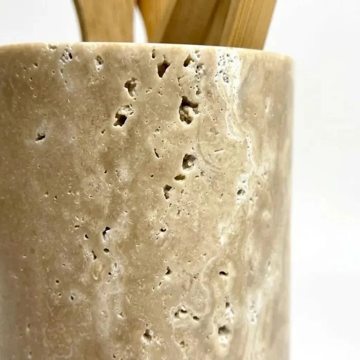 Zamansız traverten dokusu ve minimalist formuyla her alana uyum sağlayan bu ürün, mutfakta kaşıklık, banyoda fırçalık ya da salonda vazo olarak değerlendirilebilir.