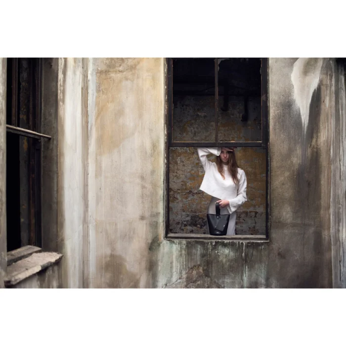 Bitkisel tabaklanmış dana derisinden sepet çanta. Üzerinde gümüş rengi iki adet 1.5cm uzunluğunda halter aksesuar ve gümüş rengi logo bulunur. Astarsızdır. İçerisinde deri sırım ile bağlı bitkisel tabaklanmış dana derisinden 9cm x 14cm boyutunda gümüş rengi fermuarlı, gümüş rengi logo baskılı ve astarsız bir çanta/cüzdan bulunur.