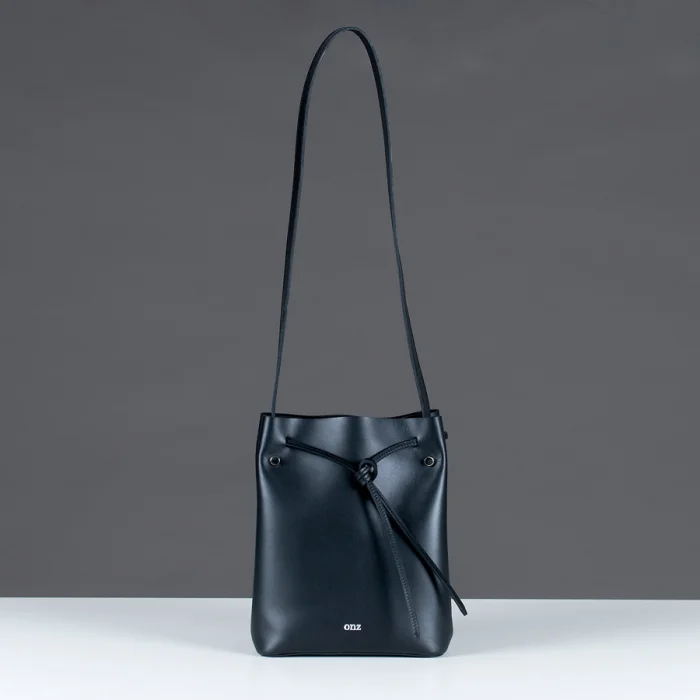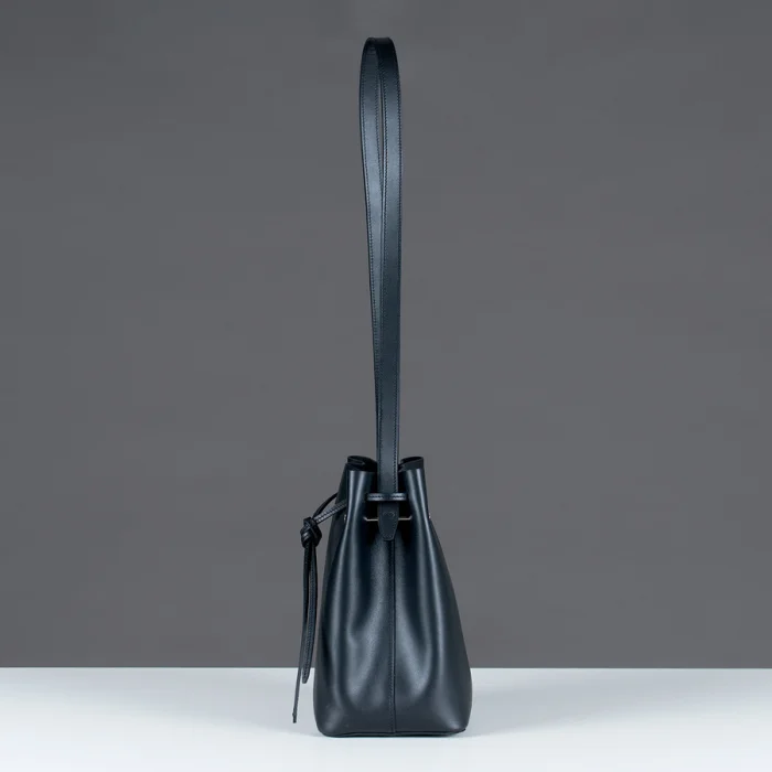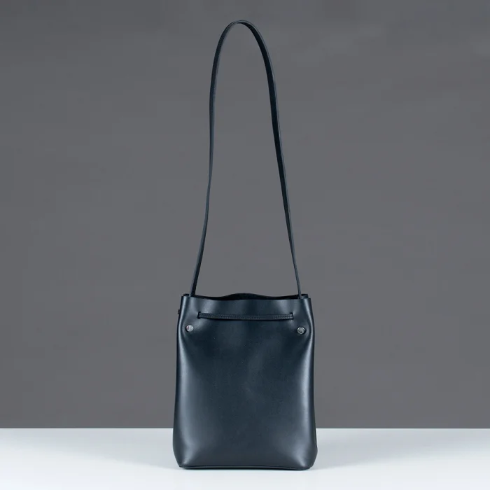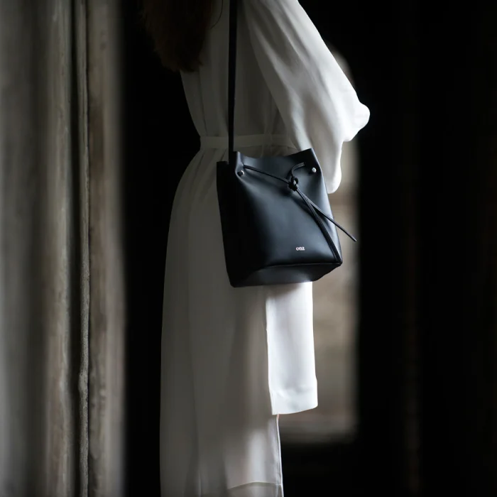 Bitkisel tabaklanmış dana derisinden büzgülü çanta. Üzerinde gümüş rengi iki adet 8cm uzunluğunda halter aksesuar ve gümüş rengi logo bulunur. Astarsızdır. İçerisinde deri sırım ile bağlı bitkisel tabaklanmış dana derisinden 11.2cm x 17.2cm boyutunda gümüş rengi fermuarlı, gümüş rengi logo baskılı ve astarsız bir çanta/cüzdan bulunur.